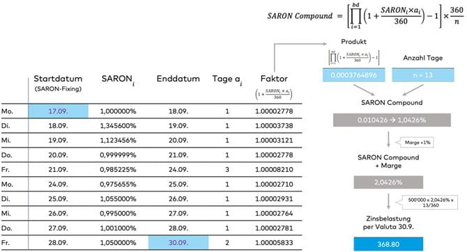 Die Höhe der Zinsbelastung per 30.09 wird wie folgt berechnet. Für die Zinsberechnung des ersten Tages, vom 17.09 zum 18.09, wird der SARON (18.00 Uhr Fixing) vom 17.09 berücksichtigt. Die kommenden Tage werden nach der gleichen Methodik berechnet. Da in diesem Beispiel die Zinsabrechnung an einem Sonntag erfolgt, wird für die letzten zwei Tage (Nacht von Fr/Sa und Sa/So) der SARON vom 28.09. berücksichtigt.