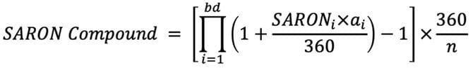 | SARONi | steht für den Wert des SARON am entsprechenden Bankarbeitstag i. Im Falle, dass das Startdatum kein Bankarbeitstag ist, wird der SARON vom vorhergehenden Bankarbeitstag berücksichtigt. |