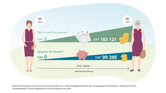 Frauen könnten mit dem Wertschriftensparen* in 25 Jahren in ihrer Säule 3a über 163 000 CHF für Ihre Altersvorsorge beiseite legen. Auf dem klassischen Sparen-3-Konto* hätten sich bei gleichen Bedingungen in der gleichen Zeit rund 99 000 CHF angesammelt.