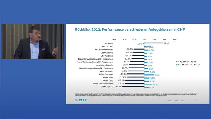 Dr. Sandro Merino, Anlagechef der Bank Cler geht in seinem Vortrag auf die Entwicklungen an den Märkten im letzten Jahr ein und erklärt, wie diese zu interpretieren sind. In seinem Ausblick präsentiert er seine Jahresfavoriten und geht näher auf die Prognosen der Anlagespezialisten der Bank Cler für 2023 ein.