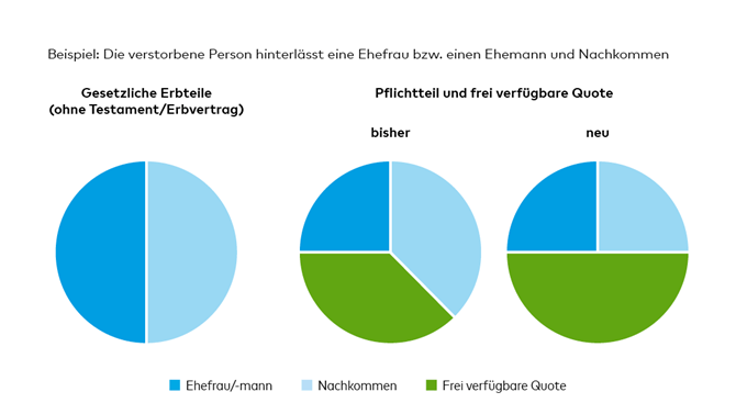 Wer ein Erbe hinterlässt, kann zwar auch künftig nur beschränkt bestimmen, wer wie viel erhält. Aber mit dem neuen Erbrecht steigt der frei verfügbare Teil (siehe Grafik). Die Pflichtteile werden reduziert – zum Nachteil der Nachkommen. Der Pflichtteil der überlebenden Ehegattin bzw. des überlebenden Ehegatten oder der eingetragenen Partnerin bzw. des eingetragenen Partners bleibt unangetastet bei der Hälfte ihres gesetzlichen Erbteils. Der Pflichtteil der Kinder sinkt mit dem neuen Erbrecht von drei Vierteln ebenfalls auf die Hälfte ihres gesetzlichen Erbteils.