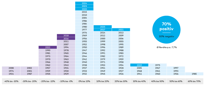 Fakt ist auch, dass wir nie wissen, wie sich das Börsenjahr entwickelt, aber in den letzten 10 Jahren waren 70% der Börsenjahre positiv, 30% negativ (im Schweizer Aktienmarkt).