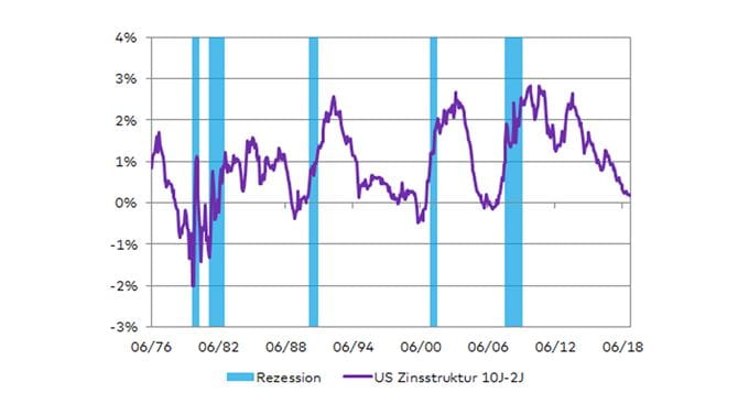 Neben den Einkaufsmanagerindizes wird zudem auch der Geldpolitik ein gewisser Vorlauf unterstellt. Für die USA hat sich besonders die Entwicklung der Zinsstrukturkurve als verlässlicher Konjunkturindikator erwiesen. Bei der Zinsstruktur werden die Obligationenrenditen verschiedener Laufzeiten verglichen. Gebräuchlich ist der Vergleich der Rendite 10-jähriger US-Staatsanleihen mit jener 2-jähriger US-Staatsanleihen. Ist die Differenz positiv, sind also die 10-jährigen Renditen höher als die der 2 Jahre laufenden Staatsanleihen, dann ist die Zinsstruktur normal. Liegen die Renditen der 2-jähringen Staatsanleihen dagegen über jenen der 10-jähringen, dann spricht man von einer inversen Zinsstrukturkurve. Dies ist meist dann der Fall, wenn die Notenbanken ihre Leitzinsen kräftig erhöhen. Eine Inversion der Zinsstrukturkurve hat in den vergangenen Jahrzehnten für die USA verlässlich Rezessionen angezeigt, in den vergangenen 30 Jahren mit einem Vorlauf von 12 und mehr Monaten (Abb. 2). Die Zinsstrukturkurve der USA hat sich bis Ende November 2018 der kritischen Marke von Null zwar deutlich angenähert, war aber noch immer normal. Auch der Einkaufsmanagerindex der Industrie lag mit 54.2 Punkten deutlich im Plus. Eine Rezession in den USA ist auf Sicht von 12 Monaten deshalb äusserst unwahrscheinlich.