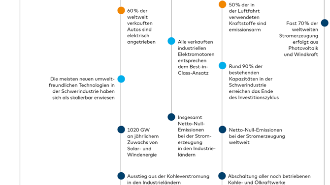 Die Elektrifizierung im Transportbereich schreitet bis 2030 rasch voran. Bis 2030 müssten rein elektrisch angetriebene Autos einen weltweiten Marktanteil von 60 Prozent er- reichen, ausgehend von weniger als 5 Prozent im Jahr 2020. Ab 2035 wären alle neu in Verkehr gesetzten Autos elektrisch oder allenfalls CO₂-neutral betrieben. Auch der heute vernachlässigbare Marktanteil von mit Wasserstoff betriebenen Lastwagen müsste schon bis 2030 auf 30 Prozent ansteigen.