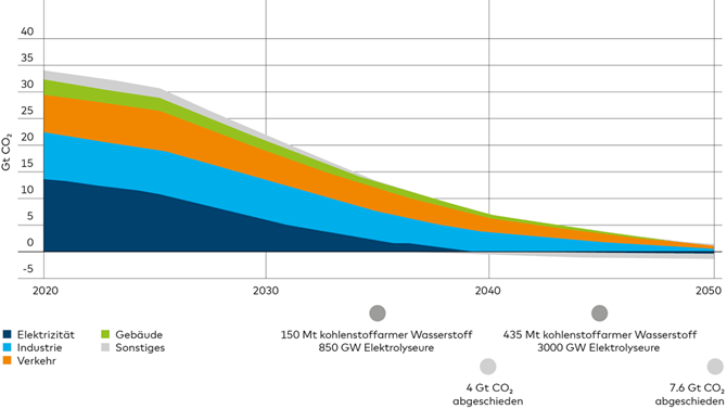 Dieser epochale Ausbau und Umbau bei der Stromproduktion erlaubt es der Industrie, die Emissionen beim Transport und bei den Gebäuden drastisch zu senken. In der Industrie müssten die CO₂-Emissionen gegenüber 2020 bis 2030 bereits um 20 Prozent sinken und bis 2050 um 90 Prozent zurückgehen. Diese Reduktionsziele bedingen den grossflächigen Einsatz von CO₂ Abscheidungstechnologien und den Aufbau von Wasserstoff-Elektrolyse- anlagen für die Industrie. Schon ab 2030 müssten global alle neuen Kapazitätserweiterungen bei Industrieanlagen CO₂-neutral erfolgen. Die Technologien für diese Innovation befinden sich heute in der Entwicklungsphase und müssten in wenigen Jahren die Marktreife für Anwendungen auf grosser Skala erreichen. Insbesondere sieht der IEA-Pfad einen starken Ausbau von CO₂-Abscheidung und -Speicherung vor. Im Jahr 2020 wurden weniger als 0,05 Gigatonnen an CO₂ abgeschieden und gespeichert. Diese jährliche Menge müsste bis 2030 auf etwa 7,5 Gigatonnen ansteigen, was Investitionen im tiefen dreistelligen Milliardenbereich bedingt.