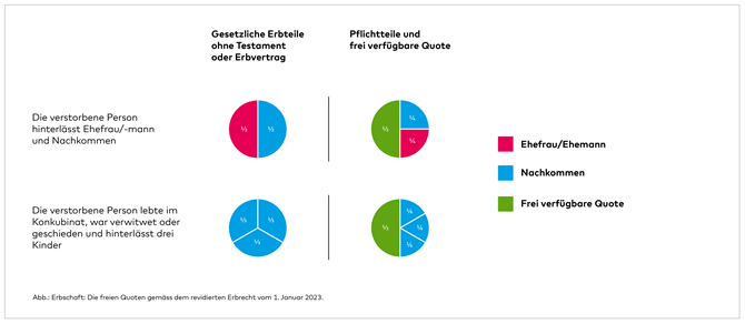 Mit einem Testament können Sie Ihren Nachlass entsprechend Ihren Wünschen regeln – solang Sie die gesetzlichen Pflichtteile berücksichtigen. Es ist mit einem Testament nicht möglich, die Ehepartnerin bzw. den Ehepartner oder die Nachkommen komplett leer ausgehen zu lassen. Aber Sie können seit der Erbrechtsrevision, die am 1. Januar 2023 in Kraft getreten ist, freier entscheiden, wem Sie wie viel von Ihrem Vermögen hinterlassen. Dank der höheren frei verfügbaren Quote können jetzt auch Stiefkinder, gemeinnützige Organisationen oder andere Personen vermehrt von einer Erbeneinsetzung profitieren (siehe Abb.). Wer nicht verheiratet ist und keine Kinder hinterlässt, kann in seinem Testament z. B. alles der Lebenspartnerin, dem Lebenspartner oder einer anderen beliebigen Person oder Organisation vererben. Für Paare, die ohne Trauschein zusammenleben, ist ein Testament besonders wichtig, da die Personen in der Partnerschaft von Gesetzes wegen keinen Erbanspruch haben.