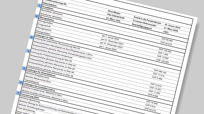 Wie viel Guthaben haben Sie in Ihrer 2. Säule bereits angespart? Wie viel davon können Sie für den Kauf einer Immobilie einsetzen? Und falls Ihnen etwas zustösst - wie hoch fällt Ihre Invalidenrente aus? Wir zeigen, wie Sie Ihren Pensionskassenausweis jetzt richtig lesen. Fordern Sie ihn noch heute bei Ihrer Pensionskasse an und lassen Sie sich von uns im Anschluss rund um Ihre Vorsorgesituation beraten.