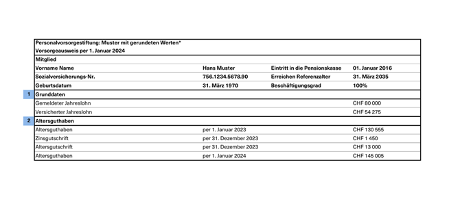 Hier sehen Sie das bisher für Sie angesparte Pensionskassenguthaben. Es besteht aus Beiträgen, die Sie selbst eingezahlt haben und denjenigen, die Ihre Arbeitgeberin für Sie entrichtet hat. Sollten Sie Pensionskassenguthaben aus früheren Arbeitsverhältnissen zu Ihrer jetzigen Pensionskasse überwiesen oder sich freiwillig in die Pensionskasse eingekauft haben, sind diese im Gesamtwert ausgewiesen. Der gesetzliche Mindestzinssatz wird vom Bundesrat bestimmt und variiert von Jahr zu Jahr. 2024 beträgt er 1,25 %. Dieser gilt für den obligatorischen Teil des Guthabens. Darüber liegende Guthaben können tiefer verzinst werden. Erwirtschaftet die Pensionskasse während eines Jahres eine gute Performance und ist eine finanzielle Stabilität gegeben, kann die Pensionskasse einen höheren Zins gewähren.