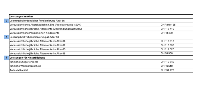 Es ist bekannt: wer sich früher pensionieren lässt, muss Einbussen bei der Rente in Kauf nehmen. Zum Teil liegen diese bei rund 7-8% pro früheres Bezugsjahr. Zum einen verdienen Sie weniger lang Geld und zahlen entsprechend kürzer in die Pensionskasse ein, zum anderen wird dieses Kapital auch weniger lang verzinst. Die Rente muss länger ausgezahlt werden, daher wird ein tieferer Umwandlungssatz angewendet und die Rente fällt entsprechend tiefer aus. An dieser Stelle Ihres Pensionskassenausweises sehen Sie die jeweilige voraussichtliche Altersrente je nach Pensionierungsjahr. Fragen Sie Ihre Pensionskasse, ob eine sogenannte Überbrückungsrente vorgesehen ist, wenn Sie früher in Pension gehen. Damit kann die fehlende AHV-Rente – die nicht vorbezogen werden kann – kompensiert werden.