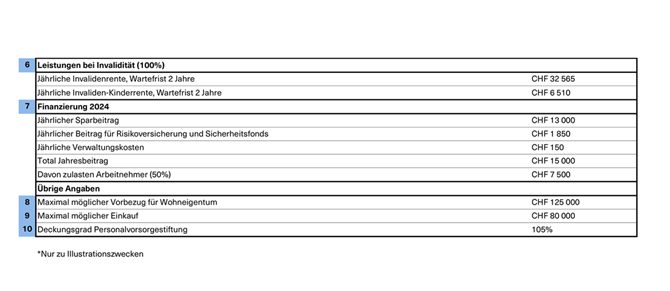 Wer aufgrund von Krankheit zu 100% arbeitsunfähig wird, kann zusätzlich zur Invalidenrente (IV) mit den hier ausgewiesenen Beiträgen rechnen. Wer mindestens 40% invalid ist, erhält eine Teilinvalidenrente der Pensionskasse. Die Beiträge werden nach einer Wartefrist ausgezahlt, während der Lohn meist durch die kollektive Krankentaggeld-Versicherung der Arbeitgeberin entrichtet wird. Diese kompensiert in den ersten 24 Monaten 80 Prozent des Lohnausfalls. Passiert ein Unfall und Sie werden erwerbsunfähig, zahlt die Pensionskasse nur Ergänzungsbeiträge zu Ihrer Unfallversicherung. In diesem Fall liegen die Leistungen der Pensionskasse weniger hoch.