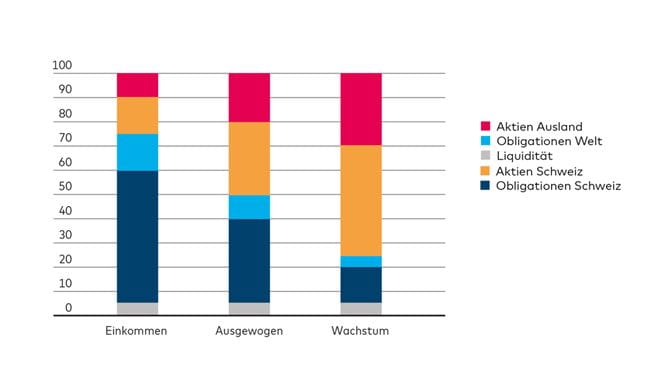 Die obligationenlastige Anlagestrategie «Einkommen» empfiehlt sich für Anleger mit begrenzter Risikofähigkeit und/ oder -bereitschaft. Historische Daten auf der Basis eines sogenannten Backtest weisen seit 1994 für die Strategie «Einkommen» eine durchschnittliche historische Rendite von 4.5 % p.a. aus. Dabei betrug der maximale zeitweilige Wertverlust 12.2 %. Hat man im ungünstigsten Moment, also direkt vor dem Kurseinbruch investiert, musste man maximal zwei Jahre und vier Monate im Verlustmodus leben