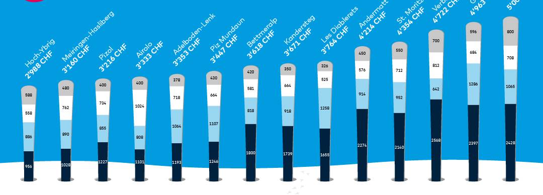 Auch die Skischule für die beiden Kinder will budgetiert sein. Bis zu CHF 350 kosten fünf Halbtage in Les Diablerets oder Kandersteg. Im Hoch-Ybrig und in St. Moritz liegen die Kosten mit rund 550 bereits deutlich höher. Der Blick aufs Matterhorn erhöht den Kostenblock für die beiden Skischüler auf CHF 800, was dann doch ein stattlicher Aufpreis ist. Weniger gross sind die Unterschiede beim Skipass für die ganze Familie: Diese reichen von 808 CHF in Airolo bis 1 286 CHF in Gstaad. Der Unterschied ist im Vergleich der gebotenen Leistung relativ gering, bietet doch Gstaad 200 Pistenkilometer, das günstigere Verbier sogar 400, Airolo jedoch gerade mal 30.