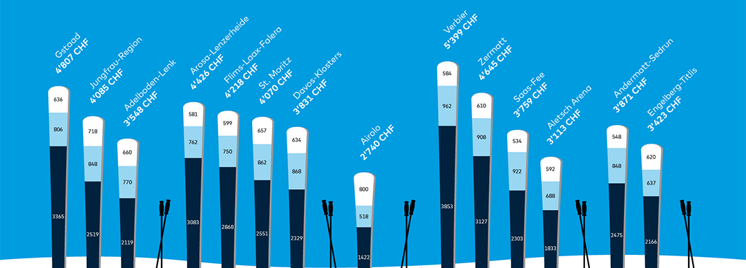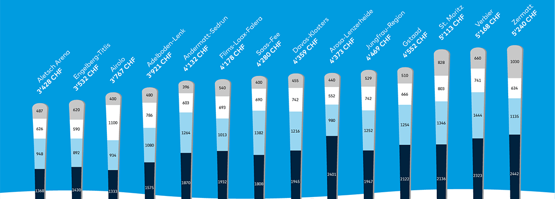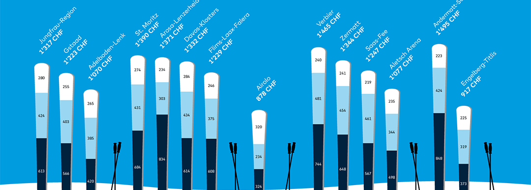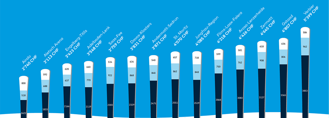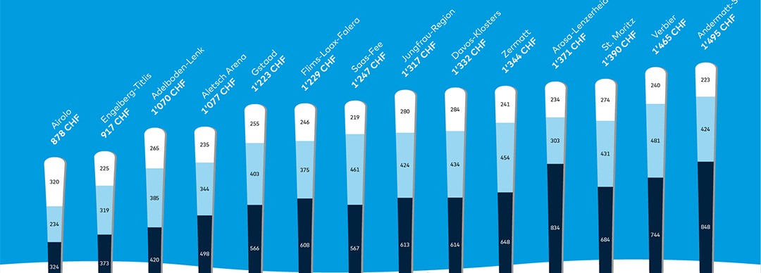 - Eine vierköpfige Familie kann rund 1 000 CHF einsparen: Während in Airolo oder in der Aletsch-Arena ca. 1 350 CHF pro Woche bezahlt werden, liegt der Preis in Arosa-Lenzerheide oder Zermatt bei über 2 400 CHF.