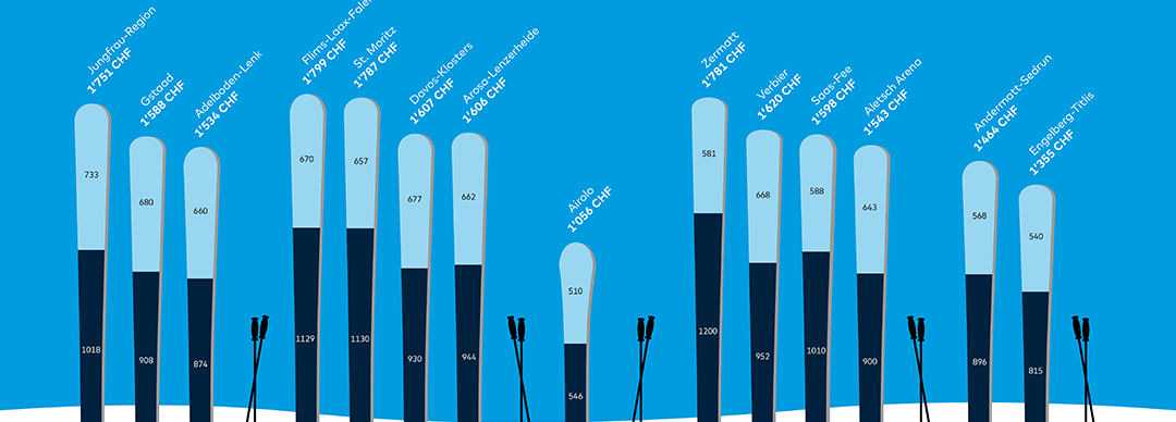 Die Preisunterschiede zwischen den Skigebieten bleiben zudem erheblich. Für ein Ehepaar kostet ein achttägiger Skipass in Zermatt rund 1 200 Franken. Wer weniger als 900 Franken ausgeben möchte, findet entsprechende Angebote in Airolo, Adelboden-Lenk, Engelberg-Titlis oder Andermatt-Sedrun. Wenn der Gesamtpreis bei Familien unter 1 000 Franken bleiben soll, kommt praktisch nur Airolo infrage; die höchsten Preise für Skipässe für Familien haben Flims-Laax-Falera (1 524 CHF) und Zermatt (1 500 CHF).