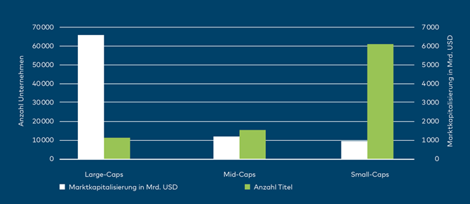 Small- & Mid-Caps, sogenannte Nebenwerte, sind Aktien mit relativ geringer Marktkapitalisierung. Die grössten Unternehmen eines Landes, auf die bei MSCI ca. 70% der Marktkapitalisierung im Streubesitz entfallen, werden als Large-Caps bezeichnet. Darauf folgen Mid-Caps, die weitere 15% der gesamten Marktkapitalisierung abdecken. Sie umfassen zusammen mit den Large-Caps das Standarduniversum. Die nächstkleineren Unternehmen fallen in den Bereich der Small-Caps, mit denen zusätzliche 14% der Marktkapitalisierung erfasst werden. Zusammen mit den Large- & Mid-Caps bilden sie das investierbare Marktuniversum. Das restliche Prozent der Unternehmen mit der geringsten Marktkapitalisierung im Streubesitz entfällt auf Micro-Caps, die üblicherweise Unternehmenswerte von nur wenigen Millionen Schweizer Franken haben und deren Investierbarkeit aus Liquiditätsgründen ausserordentlich schwierig ist. Small- & Mid-Caps werden auch als SMID-Caps zusammengefasst. Naturgemäss dominieren die Small-Caps das investierbare Aktienuniversum in Bezug auf die Titelanzahl und bieten ein Vielfaches an Auswahl relativ zu Large- & Mid-Caps (siehe Abbildung).