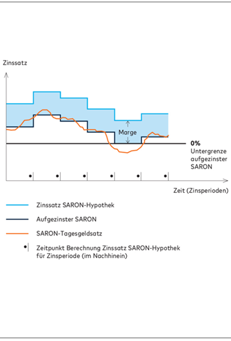 Die SARON-Hypothek basiert auf dem täglich festgelegten SARON-Zinssatz. Das heisst, an jedem Tag während der Zinsperiode wird der tagesaktuelle SARON-Zinssatz berücksichtigt. Demnach kann der Zinssatz nicht schon zu Beginn einer Zinsperiode festgelegt werden, sondern ist erst am vorletzten Tag der Zinsperiode bekannt.