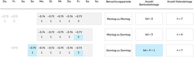 | bd | Anzahl der Bankarbeitstage in der Betrachtungsperiode, beginnend und inklusive des ersten Kalendertages (Startdatum) bis zum vorletzten Kalendertag, ausser das Startdatum ist kein Bankarbeitstag – dann wird bd um eins erhöht. Beispielsweise beträgt bd eins für eine Betrachtungsperiode von Montag bis Dienstag, zwei für eine Betrachtungsperiode von Sonntag bis Dienstag und eins für eine Betrachtungsperiode von Freitag bis Sonntag. |