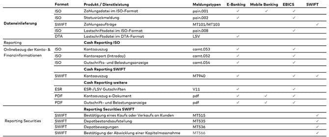 Die bisherigen SWIFT-Meldungen wie MT940, MT571 usw. bleiben bestehen. Sie werden nicht ersetzt. Die im E-Banking verfügbaren Daten können Sie entweder als SWIFT- oder als camt-Meldung anfordern oder beziehen.