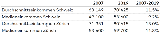 Generell kann man festhalten, dass sowohl das Durchschnittseinkommen (+0,9% pro Jahr) wie auch das Median-Einkommen (+0,7% pro Jahr) in der Schweiz im Beobachtungszeitraum von 2007 bis 2020 in ähnlichem Umfang angestiegen sind. Auch zwischen 2019 und 2020 haben sowohl das Durchschnitts- als auch das Medianeinkommen zugenommen. Trotz des Einbruchs der wirtschaftlichen Aktivitäten im Jahr 2020, haben sich dank staatlicher Stützungsmassnahmen und eines robusten Arbeitsmarktes, die Einkommen im Schweizer Durchschnitt positiv entwickelt.