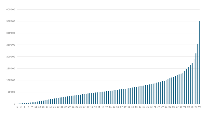 Wie sind die Reineinkommen in der Schweiz verteilt? Die folgende Grafik zeigt alle Einkommen der Schweizer Haushalte in Perzentile, die sogenannte Pen Parade im Jahr 2020. Diese unterteilen einen nach der Grösse geordneten Datensatz in hundert Teile. Die Einkommensverteilung umfasst das gesamte Einkommensspektrum einer Bevölkerung (von den niedrigsten bis zu den höchsten).