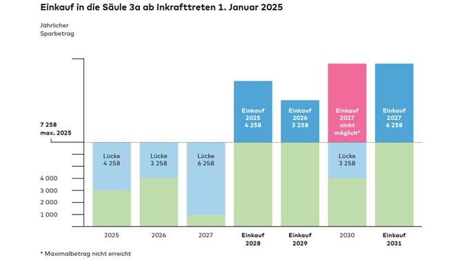 Die neue Gesetzgebung ist am 1. Januar 2025 in Kraft getreten. Eine Nachzahlung ist frühestens ab 2026 möglich, indem die Beitragslücke für das Jahr 2025 (bis max. 7 258 CHF für alle) geschlossen wird, sofern der ordentliche Maximalbetrag für 2026 bereits einbezahlt wurde. Für das laufende Jahr (2026) gelten folgende Maximalbeträge: