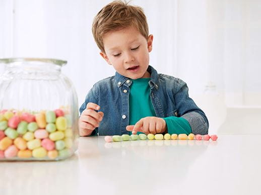 Ein junges Mädchen spielt mit vielen Klemmsteinchen und baut sich einen Turm daraus