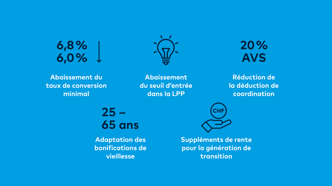 La réforme de la LPP se compose de cinq points. Quatre d’entre eux ne concernent que les caisses de pension qui assurent uniquement le régime obligatoire LPP. Seul le 5e, le financement des suppléments de rente, s’applique à toutes les personnes assurées.