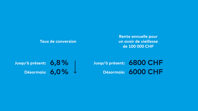 Le taux de conversion dans le régime obligatoire LPP doit être réduit de 6,8% à 6,0%. Si l’avoir de vieillesse épargné s’élève par exemple à 100 000 CHF au moment de la retraite, il en résulte actuellement une rente annuelle de 6800 CHF. Désormais, celle-ci ne s’élèverait plus qu’à 6000 CHF. Cette baisse du taux de conversion ne concerne que les personnes assurées exclusivement dans le régime obligatoire LPP. Les autres, qui bénéficient également d’une assurance surobligatoire, ne sont pas touchées de la même manière par la révision du taux de conversion.