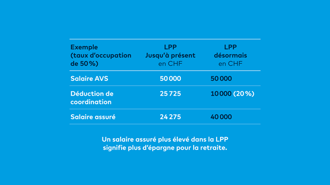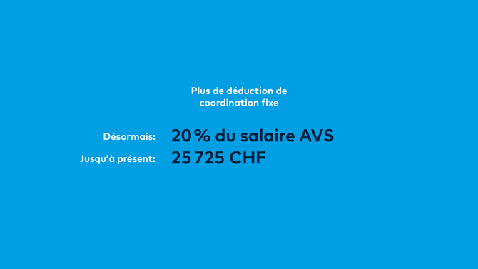 La déduction de coordination est actuellement définie comme un montant fixe, à savoir 25 725 CHF. Ce montant ne doit pas être assuré dans le régime obligatoire LPP. Désormais, cette déduction de coordination devra s’élever à 20% du salaire soumis à l’AVS. Cette mesure devrait surtout profiter aux personnes travaillant à temps partiel, car elle permet d’augmenter le revenu assuré et donc d’épargner davantage.