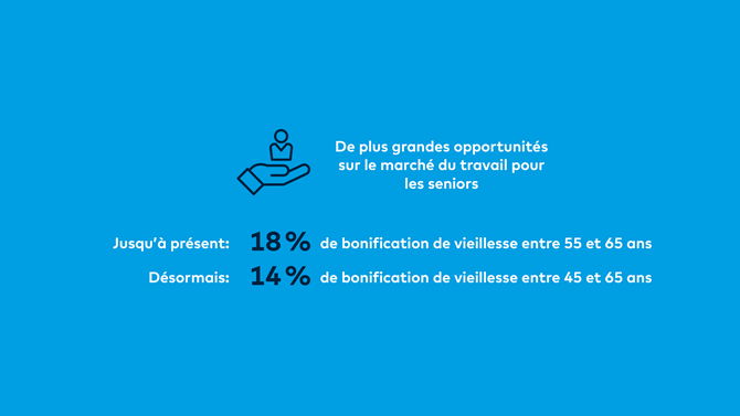 Désormais, la bonification de vieillesse doit s’élever uniformément à 9% entre 25 et 44 ans et à 14% entre 45 et 65 ans. L’employeur doit toujours cofinancer au moins 50% des bonifications de vieillesse. Le lissage des bonifications de vieillesse doit avant tout inciter les employeurs à embaucher et à maintenir en activité les personnes de plus de 55 ans.