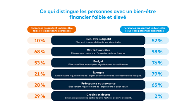 L’analyse distingue quatre groupes clairement différenciés de bien-être financier: les personnes stressées, qui peinent plus souvent à couvrir leurs dépenses courantes et leurs dettes; les personnes tendues, qui s'en sortent généralement dans la vie quotidienne, mais qui considèrent leur situation comme fragile; les personnes détendues, qui ont constitué des réserves et considèrent rarement les finances comme un fardeau; et les personnes satisfaites, qui planifient à long terme, s'appuient sur des bases financières solides et se sentent en sécurité aujourd'hui comme à l'avenir.