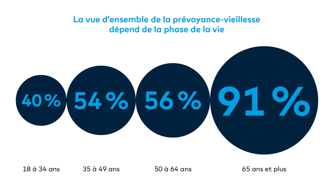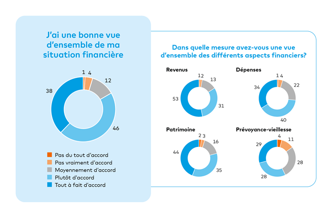 En ce qui concerne le quotidien, la majorité des personnes interrogées semblent bien organisées sur le plan financier. 84% d'entre elles déclarent avoir une bonne vue d’ensemble de leurs finances. Seules 57% savent précisément où elles en sont en matière de prévoyance-vieillesse, ce qui met un point faible en évidence.