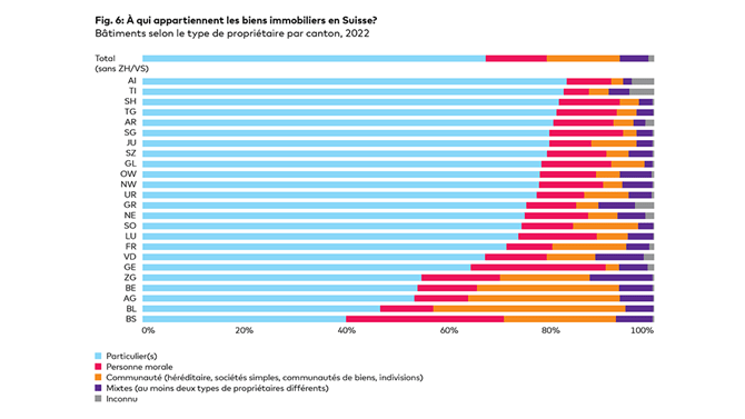 Ces mécanismes des prix sont importants pour les salariées et salariés, car une bonne partie des fonds du 2e pilier sont investis dans l’immobilier. Mais à qui appartiennent les bâtiments à usage d’habitation en Suisse? En premier lieu aux ménages, qui en possèdent environ 60%. L’OFS recense quatre autres groupes de propriétaires. Environ 11% appartiennent à des personnes morales. Derrière ce chiffre se cachent des fonds, des sociétés immobilières et des caisses de pension. Il s’agit, d’une part, des grands bailleurs helvétiques, d’autre part, des fournisseurs de produits de placement importants pour la constitution de patrimoine et la prévoyance. Les valeurs varient considérablement d’un canton à l’autre (voir fig. 6). L’immobilier en tant que catégorie de placement est important, car il est stable à long terme. Il permet de répartir les risques et sert souvent de point d’ancrage à la politique de placement. C’est un élément important de la prospérité et de la prévoyance.