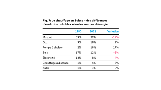 En 2022, la Suisse utilisait encore majoritairement du mazout ou du gaz pour se chauffer (voir fig. 7). La part des énergies fossiles a diminué de 10% depuis 1990, mais c’est aux constructions récentes qu’on le doit. Les sources d’énergie considérées comme durables (chauffage à distance, bois, pompes à chaleur) chauffent un tiers des bâtiments et ne jouent jusqu’à présent qu’un rôle secondaire. Leur croissance n’a été que de 14% en 32 ans. Seule la part des pompes à chaleur a fortement augmenté. En revanche, le chauffage au bois a reculé et le chauffage à distance est pratiquement insignifiant. Des efforts et des investissements importants sont encore nécessaires pour mettre les immeubles en conformité avec la réglementation. Ceux qui n’y parviendront pas pourraient perdre énormément de valeur. Aux Pays-Bas, par exemple, il est interdit depuis 2023 d’utiliser ou de louer des bâtiments qui n’atteignent pas certaines classes énergétiques.