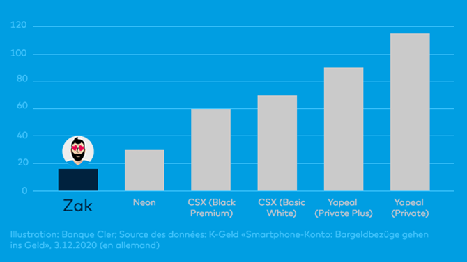 C'est ce que montre le récent comparatif sur les banques via smartphone effectué par le magazine K-Geld. Si tu renonces aux retraits d'espèces aux Bancomat tiers et paye à l'étranger avec le paiement mobile gratuit, tu peux même réduire les coûts à 0 CHF.