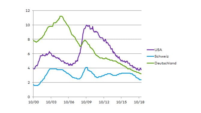 Sur le marché du travail règne le plein emploi dans de nombreux secteurs. En septembre dernier, le taux de chômage aux États-Unis est tombé à son plus bas niveau depuis janvier 1970, et en Allemagne, un nouveau record à la baisse par rapport à l’année de la réunification a été enregistré mois après mois (fig. 4). En Suisse aussi, les entreprises peinent actuellement à recruter du personnel qualifié. Les deux facteurs économiques de production, le travail et le capital, sont donc toujours plus utilisés. Même si la demande de biens demeure élevée, il sera de plus en plus difficile de maintenir les taux de croissance à leur haut niveau de ces dernières années.