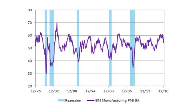Tout comme l’indice des directeurs d’achat, la politique monétaire donne une idée de la future tournure des événements. L’évolution de la courbe des taux d’intérêt, entre autres, s’est avérée être un indicateur fiable pour les États-Unis. La structure des taux d’intérêt compare les rendements obligataires de différentes échéances. Il est d’usage de comparer le rendement des emprunts d’État américains à 10 ans et à 2 ans. Si la différence est positive, c’est-à-dire que les rendements des emprunts à 10 ans sont supérieurs à ceux des emprunts à 2 ans, la structure des taux est normale. Si, au contraire, les rendements des emprunts à 10 ans sont inférieurs à ceux des emprunts à 2 ans, on parle de courbe des taux inversée. C’est généralement le cas lorsque les banques centrales relèvent fortement leurs taux directeurs. Au cours des dernières décennies, l’inversion de la courbe des taux aux États-Unis a indiqué de manière fiable des récessions, avec une avance de 12 mois et plus ces 30 dernières années (fig. 2). Fin novembre 2018, la courbe des taux américains s’était significativement rapprochée du point critique zéro, mais elle était toujours normale. L’indice des directeurs d’achat s’établissait lui aussi dans le vert, à une confortable valeur de 54,2 points. Une récession aux États-Unis au cours des 12 prochains mois est donc extrêmement improbable.