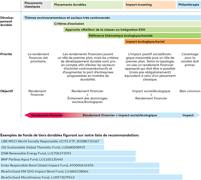 Nous plaçons sur notre liste de recommandation de fonds de placement durables plusieurs fonds en actions et en obligations de prestataires tiers qui répondent à nos exigences strictes en matière de durabilité et revêtent en outre une forte dimension écologique ou sociale. Cela inclut les fonds thématiques durables, ainsi que les fonds en green bonds et en social bonds. Pour les investisseurs qualifiés intéressés par l’impact investing, il existe la possibilité d’un placement dans un fonds de microfinance.