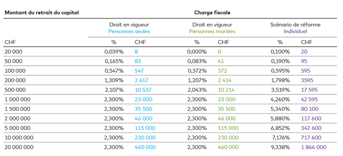 Jusqu'à présent, l'imposition commune a eu pour effet d'alourdir la charge fiscale pesant sur les retraits du capital en raison de la progressivité du barème d'imposition. Cet effet dit de progressivité disparaît avec la réforme, ce qui rend l'impôt fédéral direct plus avantageux sur le plan fiscal pour de nombreux couples mariés.