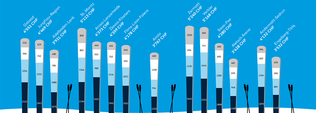 Peu importe le segment de clientèle (familles de quatre personnes, couples, étudiants), Aletsch-Arena, Engelberg-Titlis et Airolo affichent les prix les plus bas en 2022. Une famille devra débourser 3428 CHF à Aletsch-Arena, 3532 CHF à Engelberg-Titlis et 3767 CHF à Airolo. Un couple pourra passer des vacances à moindres frais à Airolo (2740 CHF), à Aletsch-Arena (3113 CHF) ou à Engelberg-Titlis (3423 CHF). Pour les étudiants également, Airolo propose les prix les plus bas (878 CHF), talonné par Engelberg-Titlis (917 CHF) et Adelboden (1070 CHF), qui pratique des tarifs avoisinant ceux d’Aletsch-Arena (1077 CHF).