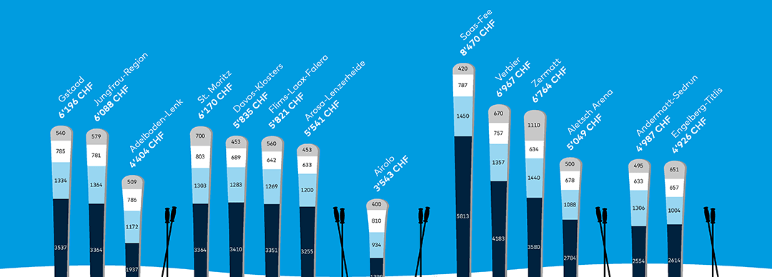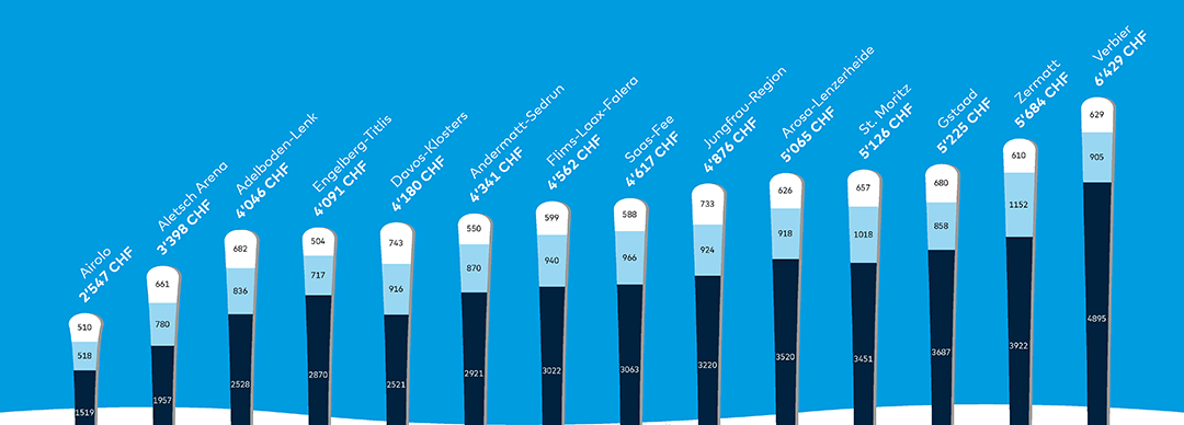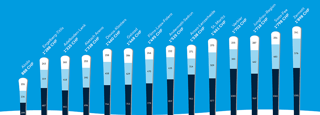 Peu importe le segment de clientèle (familles de quatre membres, couples, étudiantes et étudiants), Aletsch-Arena, Adelboden-Lenk et Airolo affichent les prix les plus bas en 2024. Une famille passera les vacances les moins onéreuses à Airolo (3543 CHF), suivie d’Adelboden-Lenk (4404 CHF) et d’Engelberg-Titlis (4926 CHF). Un couple misera quant à lui sur Airolo (2547 CHF), Aletsch-Arena (3398 CHF) ou Adelboden-Lenk (4046 CHF). Pour la clientèle étudiante également, Airolo propose les prix les plus bas (888 CHF), talonnée par Engelberg-Titlis (1288 CHF) et Adelboden-Lenk (1325 CHF).