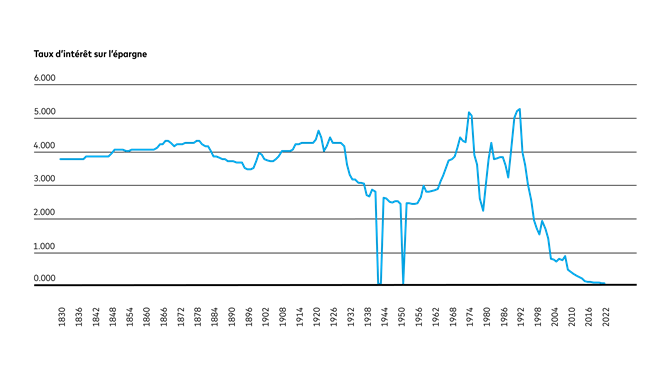 Pendant un siècle, les taux d’intérêt sur l’épargne tournaient autour de 4%. Durant et après la Seconde Guerre mondiale, ils sont tombés à zéro à deux reprises avant de connaître une forte augmentation. Les taux ont atteint des niveaux maximaux, autour de 5%, au milieu des années 1970 et au début des années 1990. Depuis lors, les taux d’intérêt n’ont cessé de baisser, et ces dernières années, ils étaient pratiquement de zéro.