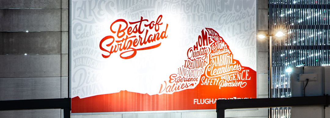 Oui, j’y ai conçu une immense affiche sur la façade avec un Cervin composé de mots qui caractérisent la Suisse. L’un de mes rêves est de décorer un avion. J’adore voler, j’aimerais être constamment dans les airs, partir 24 heures en Australie et revenir aussitôt – ce serait des vacances pour moi!