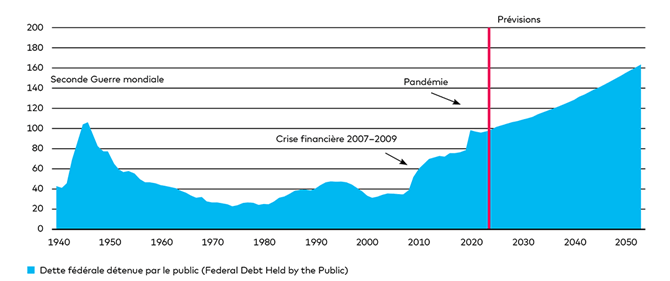Avec son taux de croissance réelle de près de 2,5%, l’économie américaine se développe plus vite que celle de la zone euro depuis la fin de la pandémie. Mais la dette publique, sous forme de titres de créance usuels, suit la même trajectoire: elle avoisine 100% du PIB annuel du pays, un niveau deux fois plus élevé qu’en 2010 et similaire à celui atteint pour la dernière fois à la fin de la Seconde Guerre mondiale. Combien de temps cette flambée de la dette peut-elle durer et quelles sont les possibles répercussions?