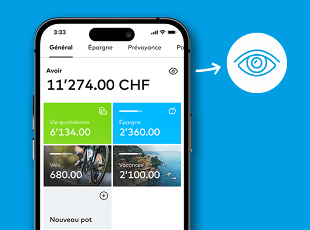 En fin d'année, nous avons introduit une nouvelle fonction qui te permet de masquer ou d'afficher le solde de ton compte. En cliquant sur l'icône de l'œil, tu peux décider à tout moment que tes valeurs patrimoniales soient affichées ou non dans l'appli.