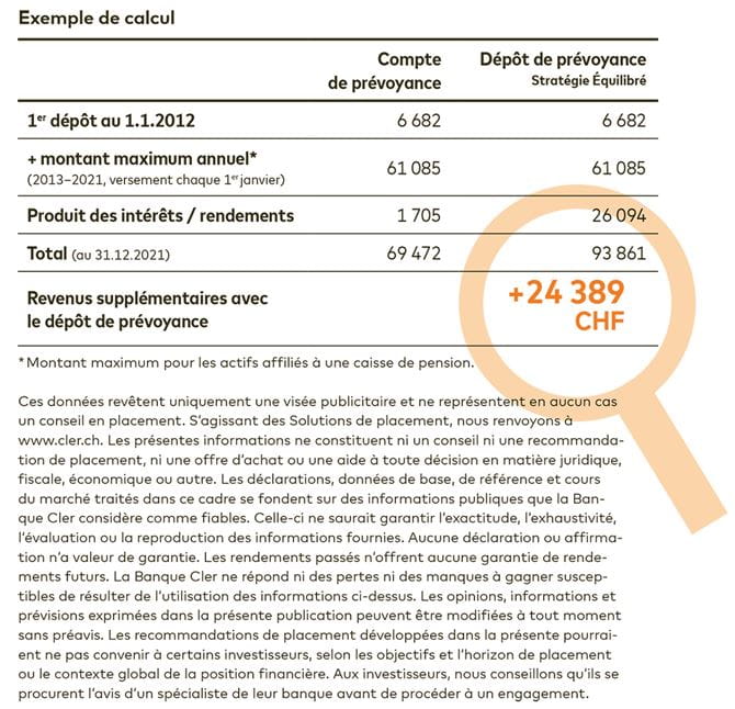 Le graphique suivant montre qu'un dépôt de prévoyance a affiché de biens meilleurs résultats au cours des dernières années qu'un compte de prévoyance à taux fixe. Sur une période de 10 ans, de 2012 à 2022, les rendements supplémentaires du dépôt de prévoyance se sont élevés à 35%.
