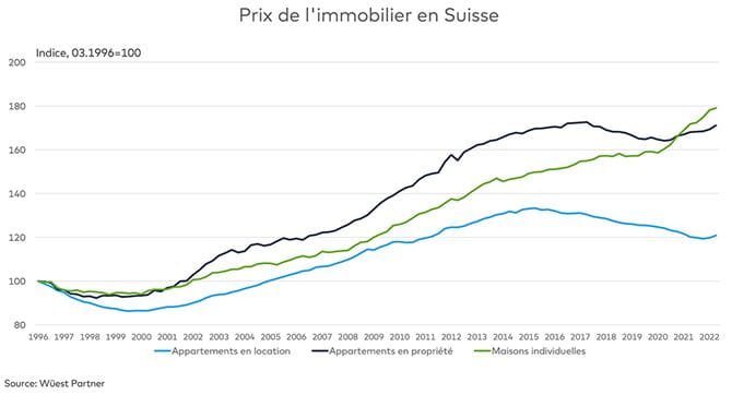Si, habituellement, la hausse des prix des hypothèques entraîne une baisse des prix de l'immobilier, on n'observe pas cette tendance pour l'instant: les prix des logements en propriété et en particulier des propriétés par étages (voir graphique) en Suisse poursuivent leur haussev. Il est difficile de prévoir la future évolution, mais en principe, la valeur des biens immobiliers dont l'emplacement est prisé ne va pas baisser à l'avenir. En revanche, les prix pourraient chuter dans les zones peu demandées.