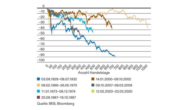 Si l’on jette un regard rétrospectif sur les six mois écoulés, on constate que nous avons vécu une mise à l’arrêt de la vie publique et de la vie privée que nous n’aurions jamais pu imaginer. S’agissant de l’économie, les économistes parlent du plus grand effondrement conjoncturel depuis la Seconde Guerre mondiale. Sans l’intervention rapide et courageuse des gouvernements et des banques centrales, nous serions sans doute dans une profonde dépression. Les crédits et les cautionnements accordés, les programmes de dépenses ainsi que les mesures massives de politique monétaire ne pourront certes pas empêcher qu’un grand nombre de personnes subissent finalement de manière tangible les séquelles du freinage conjoncturel. Mais ces mesures donnent les impulsions nécessaires pour que nous nous en tirions finalement à bon compte selon toute probabilité. Cet espoir se reflète également dans l’évolution des marchés des actions. Après que quelques indices des actions eurent encore atteint de nouveaux pics pendant les premières semaines de l’année, ils connurent jusqu’à la mi-mars un effondrement d'une rapidité quasiment jamais connue au cours des 100 dernières années (voir graphique). Il en va de même également pour la reprise survenue par la suite, qui a permis au NASAQ, l’indice des valeurs technologiques américaines, d'atteindre un nouveau sommet au mois de juin déjà. Le marché des actions suisse n’affichait plus qu’un recul de 3 % au 30 juin depuis le début de l’année. Des chutes de cours de plus de 30 % (jusqu’au plus bas concerné) depuis le pic précédent