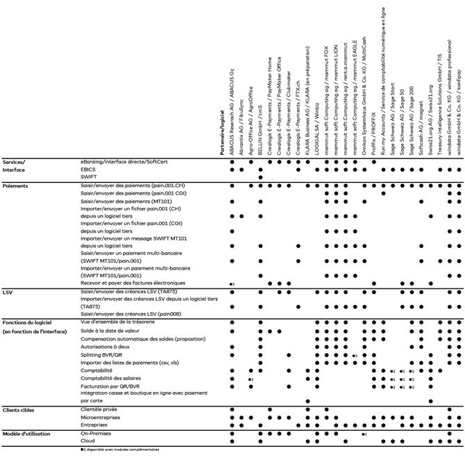 Via la rubrique «Paiements» > «Chargement du fichier de paiement», vous accédez au menu qui vous permet de sélectionner et de charger le fichier en question. Divers logiciels permettent par ailleurs la transmission directe de paiements en attente à l’E-Banking.