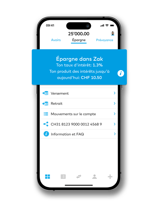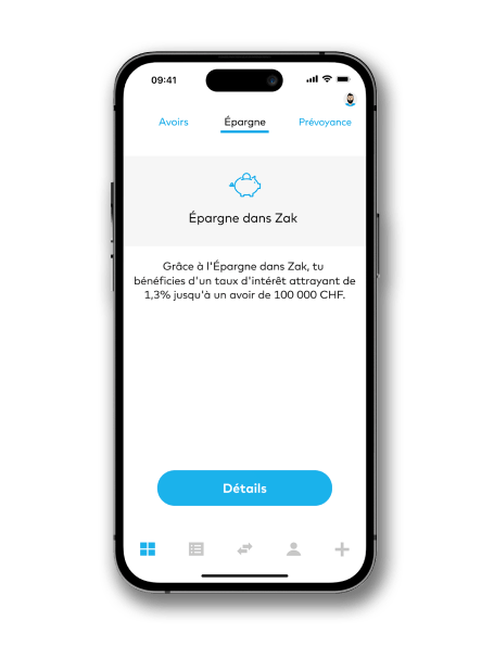 L'Épargne dans Zak consiste en un compte d'épargne ouvert directement dans Zak. Avec l'Épargne dans Zak, tu profites d'un taux d'intérêt plus élevé que sur le compte privé Zak.